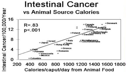 一个由北京协和医院等单位的著名医师组成的医疗委员会调查显示,肉食与癌症有正相关。调查报告这样写道:“北京市癌症发病情况,1996年是1955年5.2倍。我们调查了城区的医院、居民,上个世纪大肠癌患病比例是十万分之十以下,八十年代十万之二十,九十年代十万之二十四,2001年十万分之六十点四五。为什么城市里的癌症病人越来越多?证据显示,跟饮食有关,吃肉多了,不吃粗粮,纤维素少了……。调研结论显示:癌症的增长率跟肉食的增长率曲线相似甚至多处重合” ,据此,国内报告与国外同行的结论一致。