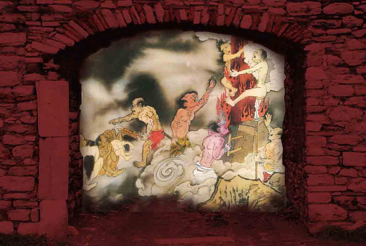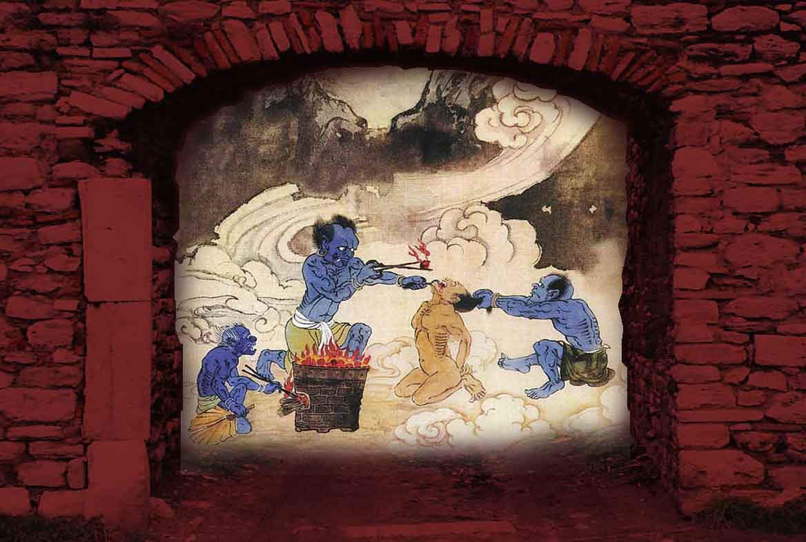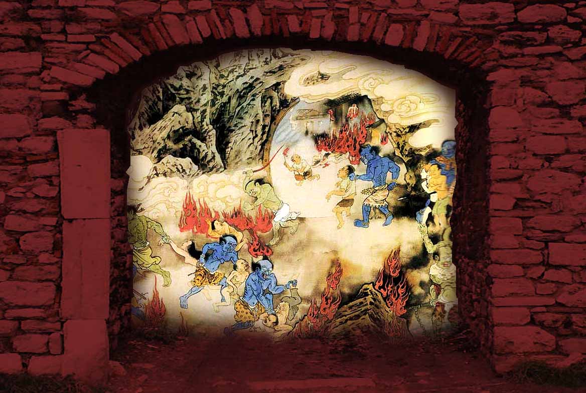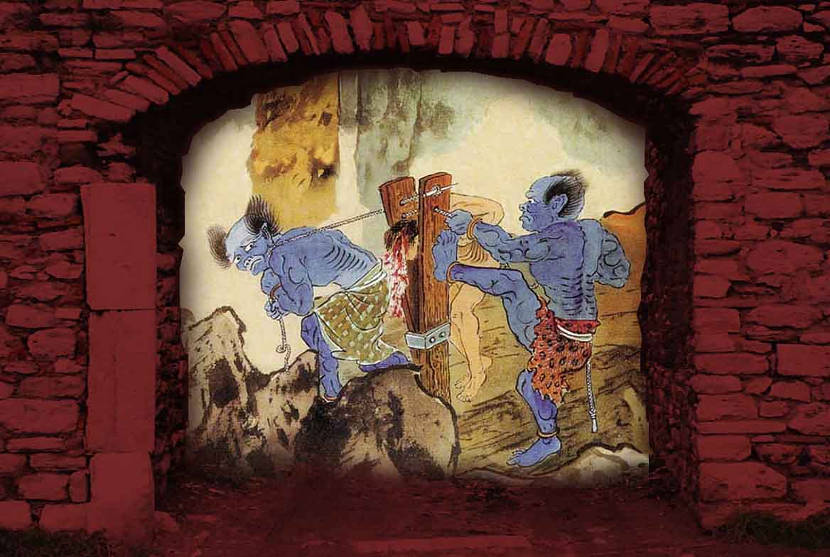 地獄之中,隨時可見成千上萬夜叉厲鬼,血口鋼牙,眼如電光,利爪如鋼鐵,箝制罪犯,押解拖曳至各大小地獄。