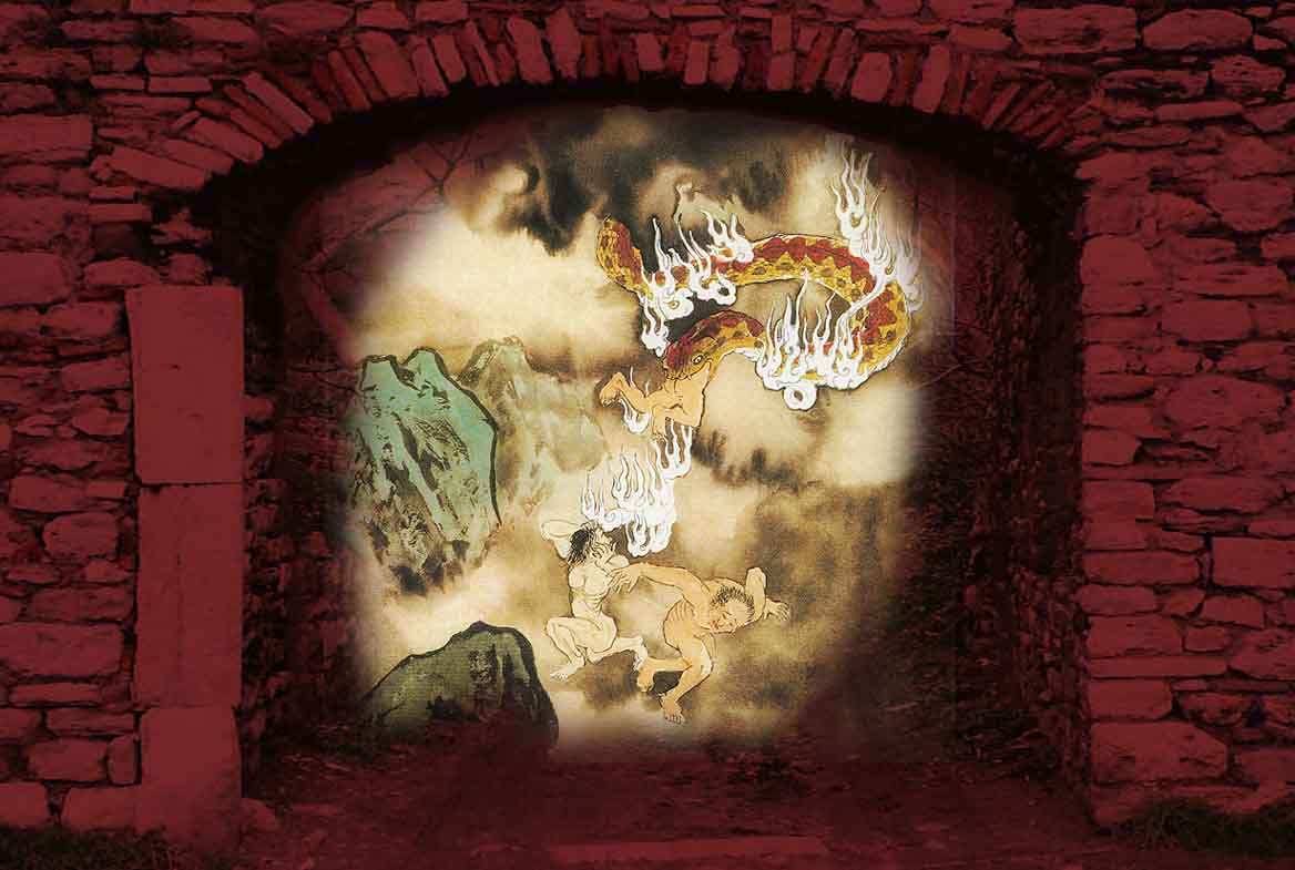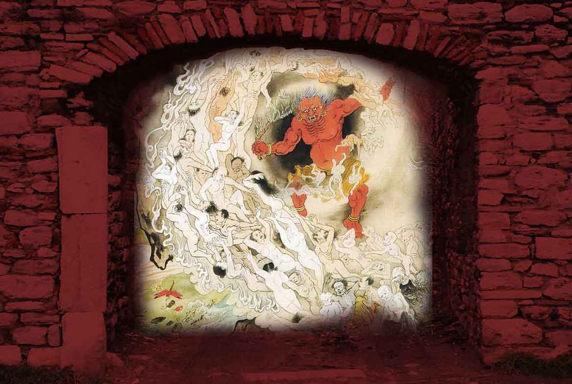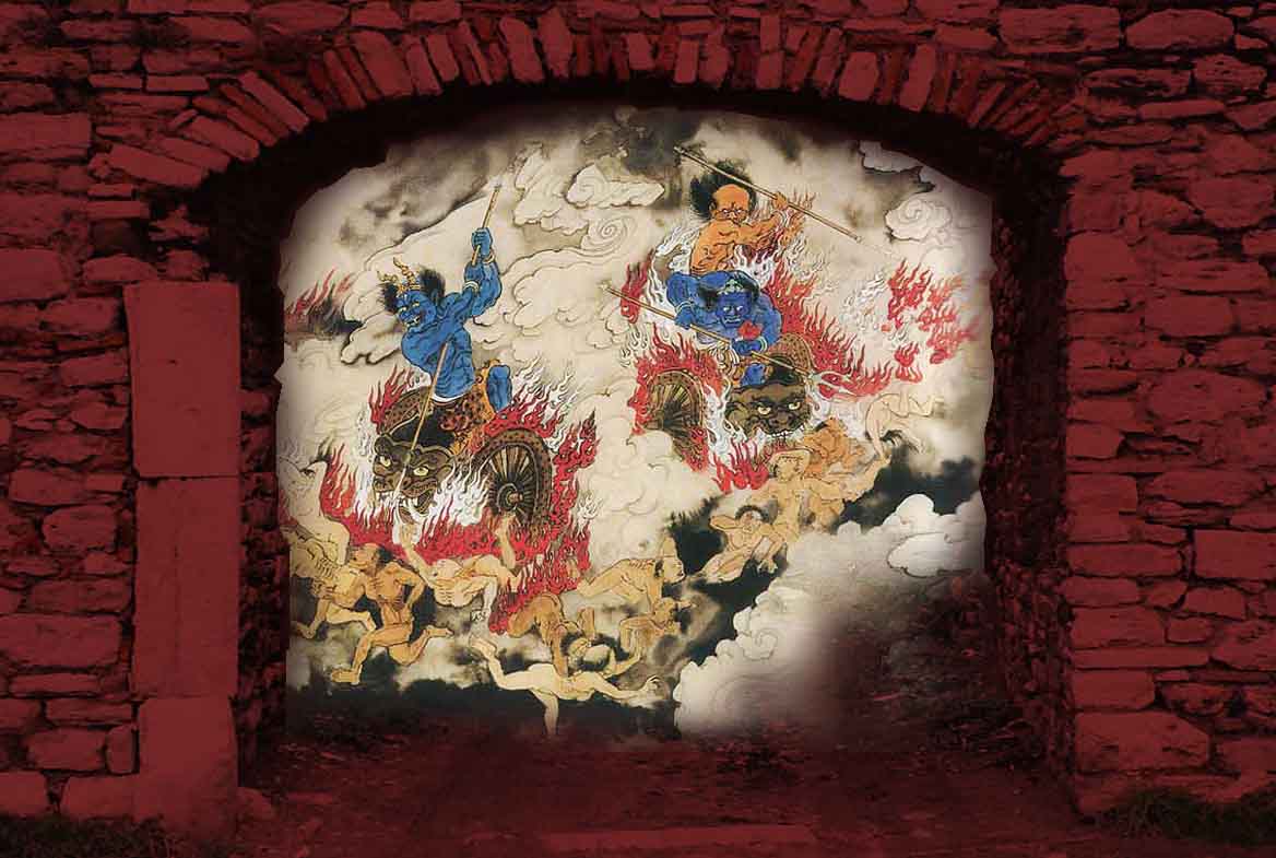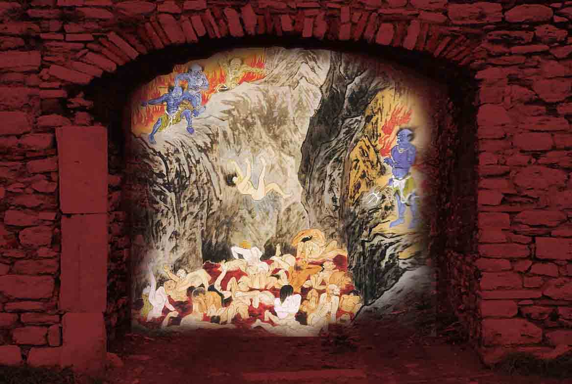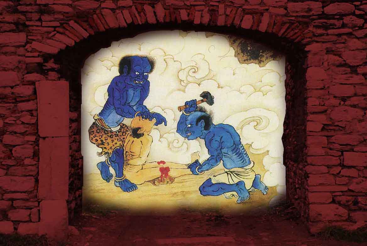 地獄之中,隨時可見成千上萬夜叉厲鬼,血口鋼牙,眼如電光,利爪如鋼鐵,箝制罪犯,押解拖曳至各大小地獄。