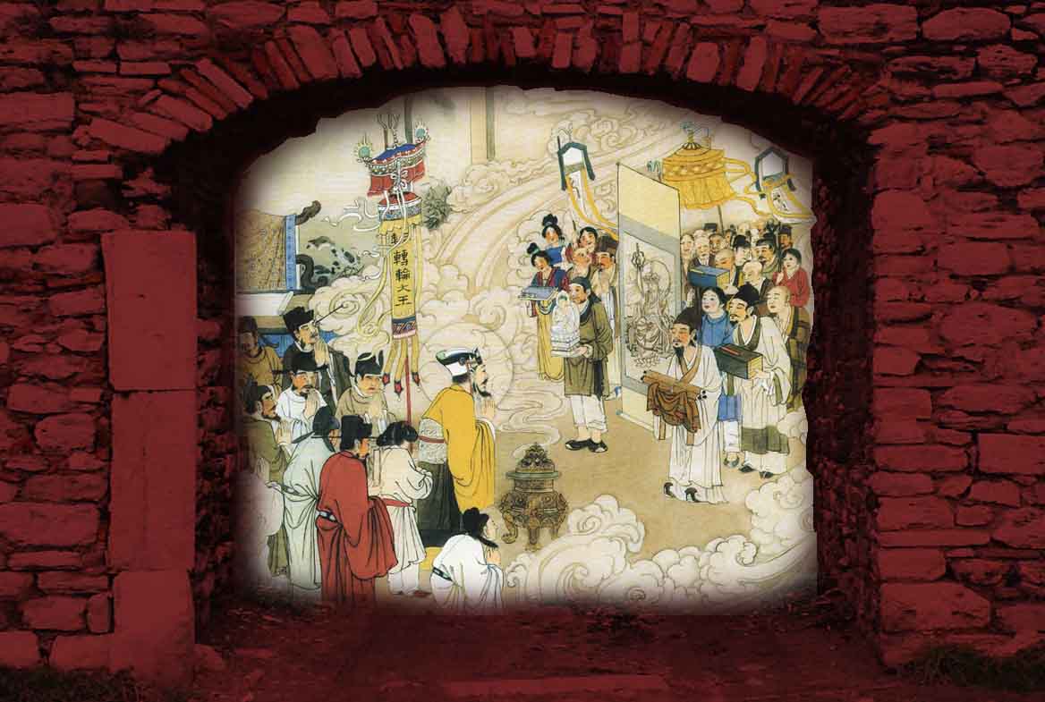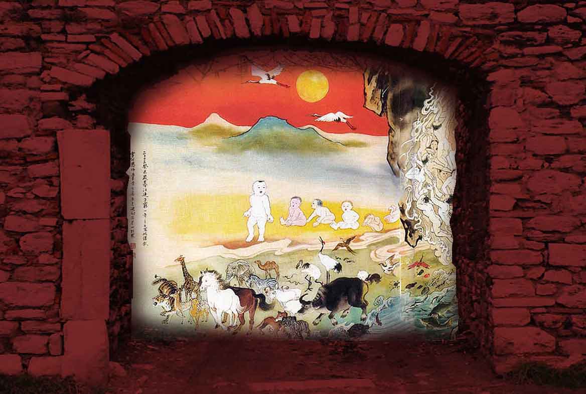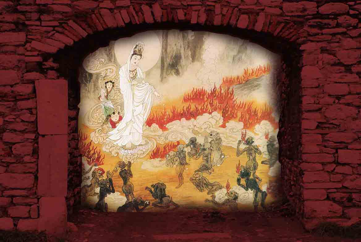 兩千年春,我在星洲,許大佬專程來訪,故鄉城隍多次附其身語我,先是道及我五、六歲時童年故事,令我信是真實附身。他盼望能修復城隍廟,我向他說明礙於現前國家政策,修復之事具有實際困難,城隍亦頗理解,於是要求能恢復閻王殿。我回憶童年,六、七歲時,依稀記得,慈母時常攜我至城隍廟燒香,十王殿中雕塑地獄變相造型栩棚如生,歷歷在目,與我影響至深至遠,以至於一生中起心動念不敢起惡念惡行,益加深刻了解因果教育影響童心至大。於是建議以石刻浮雕置於佛寺中,彰顯城隍慈悲教化之德。有頃,城隍言:石刻浮雕工程甚大,不如以圖畫代之,同時另作一幅極樂世界圖,詳加說明,以示世人。並期望能印送全球佛教道場,才能真正落實因果教育,挽救現前劫運。我深表贊同城隍建議,於是想到同門學道之當代大畫家,故人江逸子先生,言及城隍附身之奇遇,並商請製作地獄變相及極樂世界二圖,贈送各地博物館、大學、道場收藏展覽。江先生聞之,歡喜應允請求,並告以先師住世時亦曾囑作二圖。我說:「師命有因,城隍為緣,因緣和合,此一大事因緣,非先生神手莫屬也。」如此偉大鉅製竟然於一年之中竣成。地獄變相圖高二十六英寸,長五十米,信是神來之筆,使我深感此乃諸佛菩薩、城隍眾神慈悲加持,為挽救今世之空前浩劫之大作耳!
