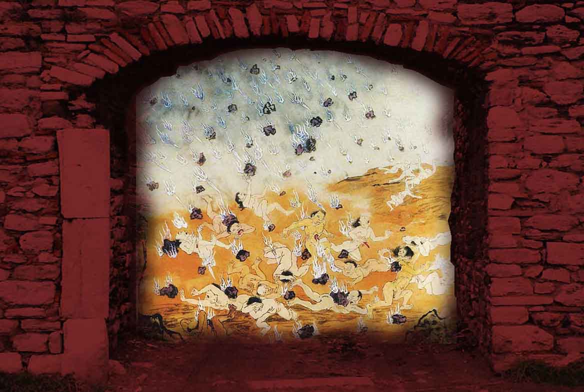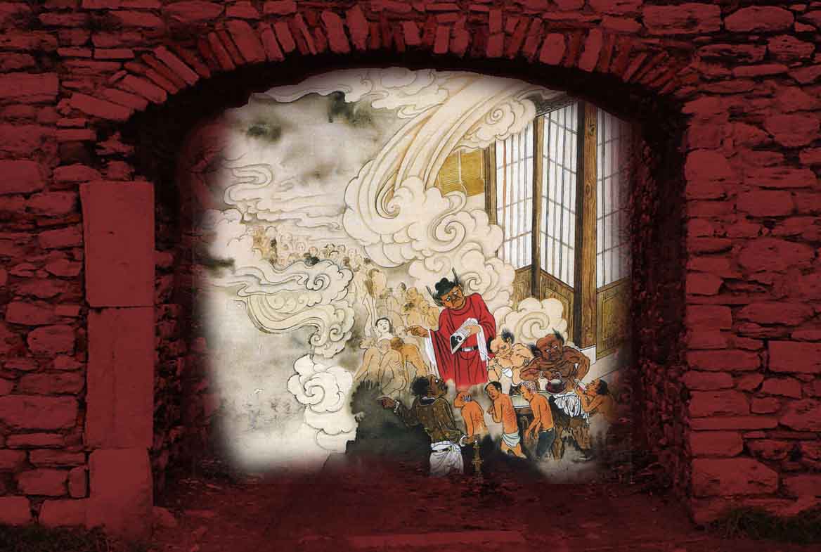 飄過地獄門,巍巍鐵鑄的山巖峭壁,冒著終古不熄的赤燄,一望而無際。報到後的幽魂,不分貧富貴賤或男女老少,每人身邊都伴著一位猙獰可怖的厲鬼「隨從」,如影隨形;以鐵鍊套頸,牙棒摧身,拖拉前進。這些夜叉厲鬼,隨情緒而變色異形,或青、或綠,或人、或獸,十分恐怖。