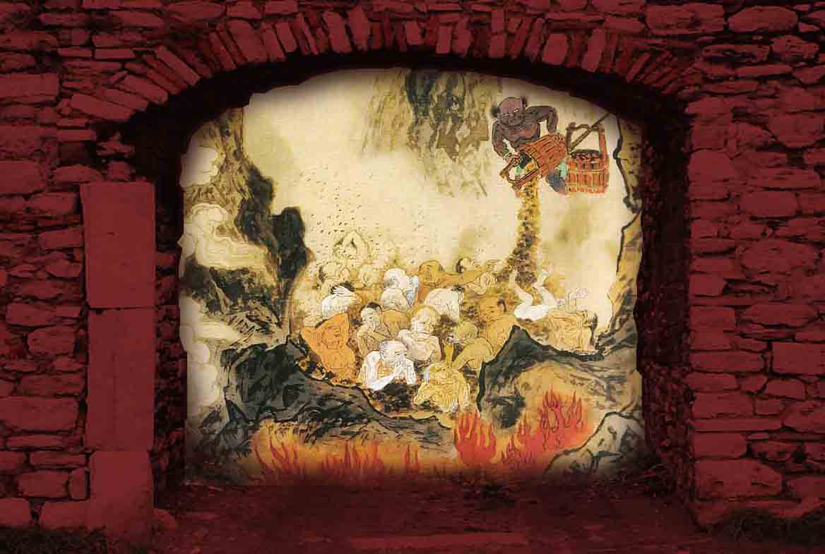 迷朦光中,幾個青面差使,押解一批罪犯,在寒鐵山洞穴中穿梭而過。這批罪犯,個個衣冠楚楚,看得出其生前之顯赫與榮耀,從服飾穿著來看,有不同的階級與地位;有的應該是政客,有的應是掌有權位的學者,在他們的神色之間,依然殘留幾分得意與跋扈。孱雜人群中也有宗教人士、神職道侶,享盡人間一切福報,辜負眾生之供養。此時個個神情凝重,似乎已嗅到「大事不妙」的氣息。