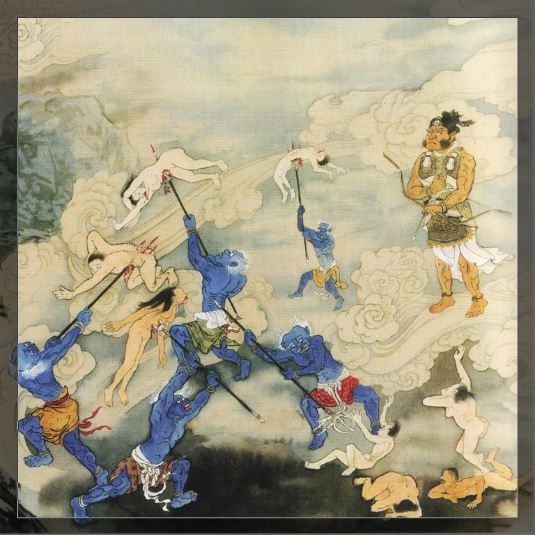 经云:「心业画师,自业画作。」如是因,如是果,怨谁呢?厉鬼现出你生前残酷模样,手执利斧支解你的身体,四周狼群环伺,垂涎等待,不正是你自己感召来的!