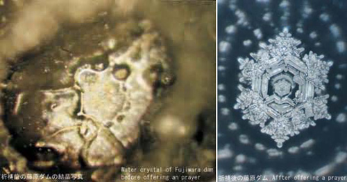 图2 日本加藤住持对着藤原湖水念诵佛教咒语之前和之后的水结晶